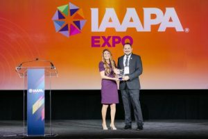 Pictured Above: Lauren Weaver (left) with Sally Dark Rides presenting Phil Wilson (right) with the IAAPA Meritorious Service Award.