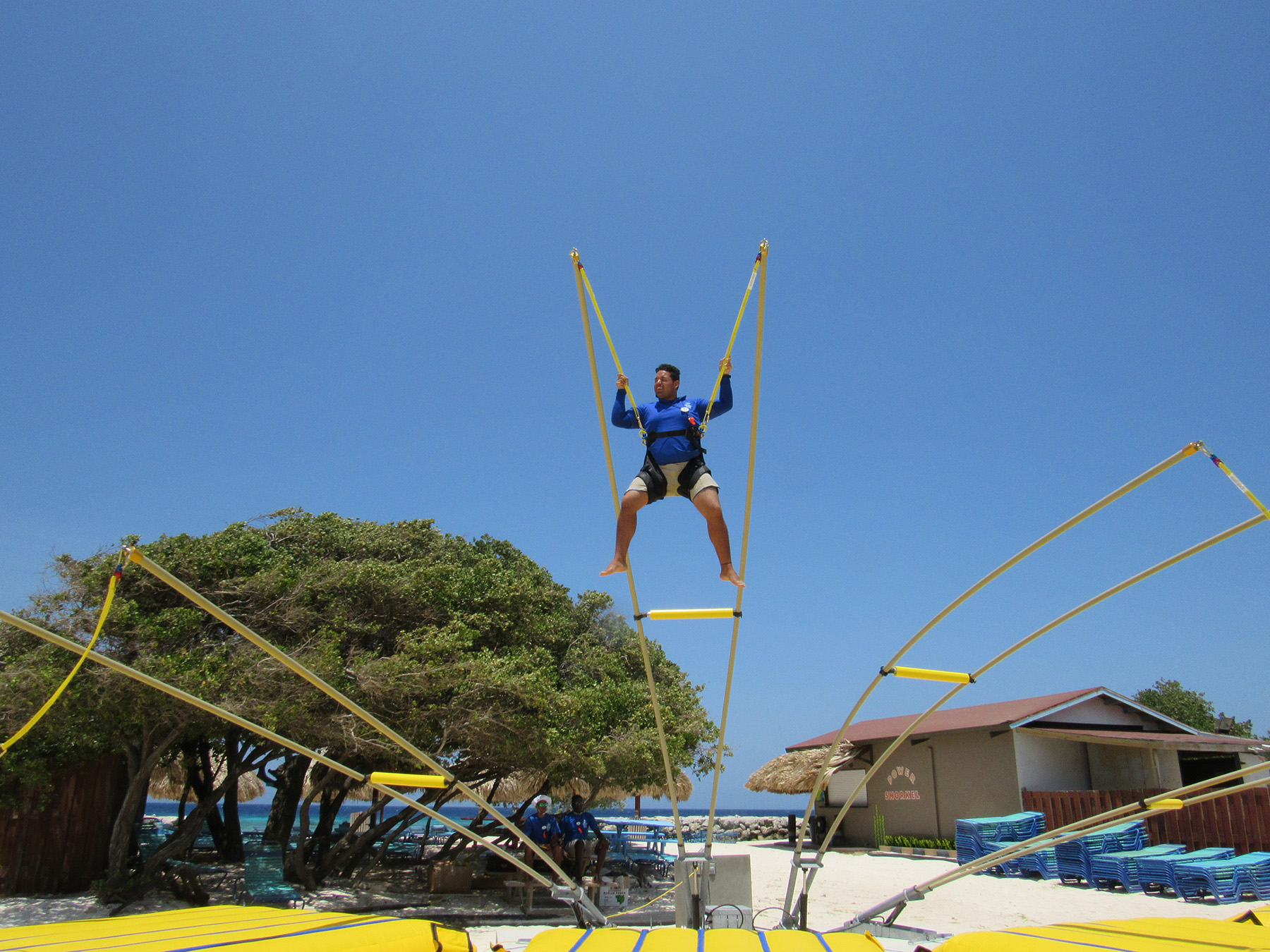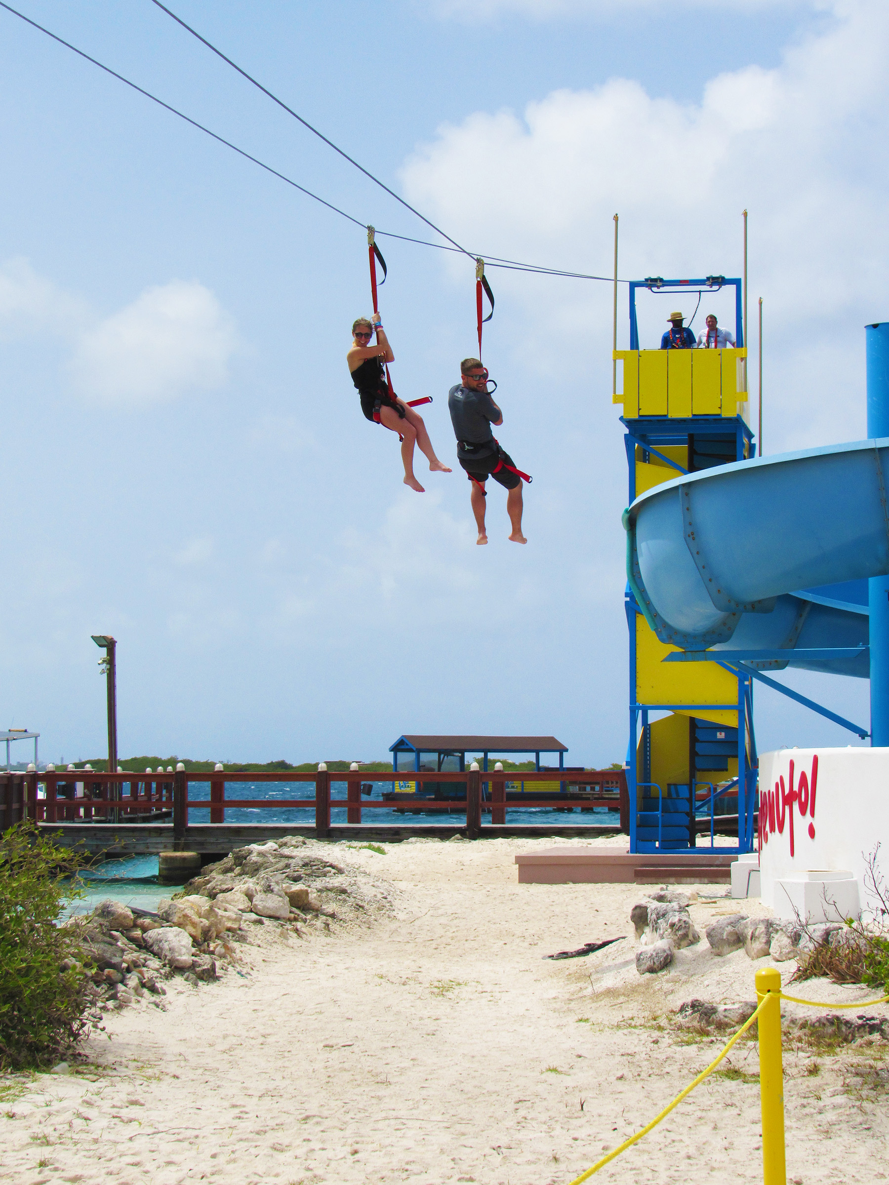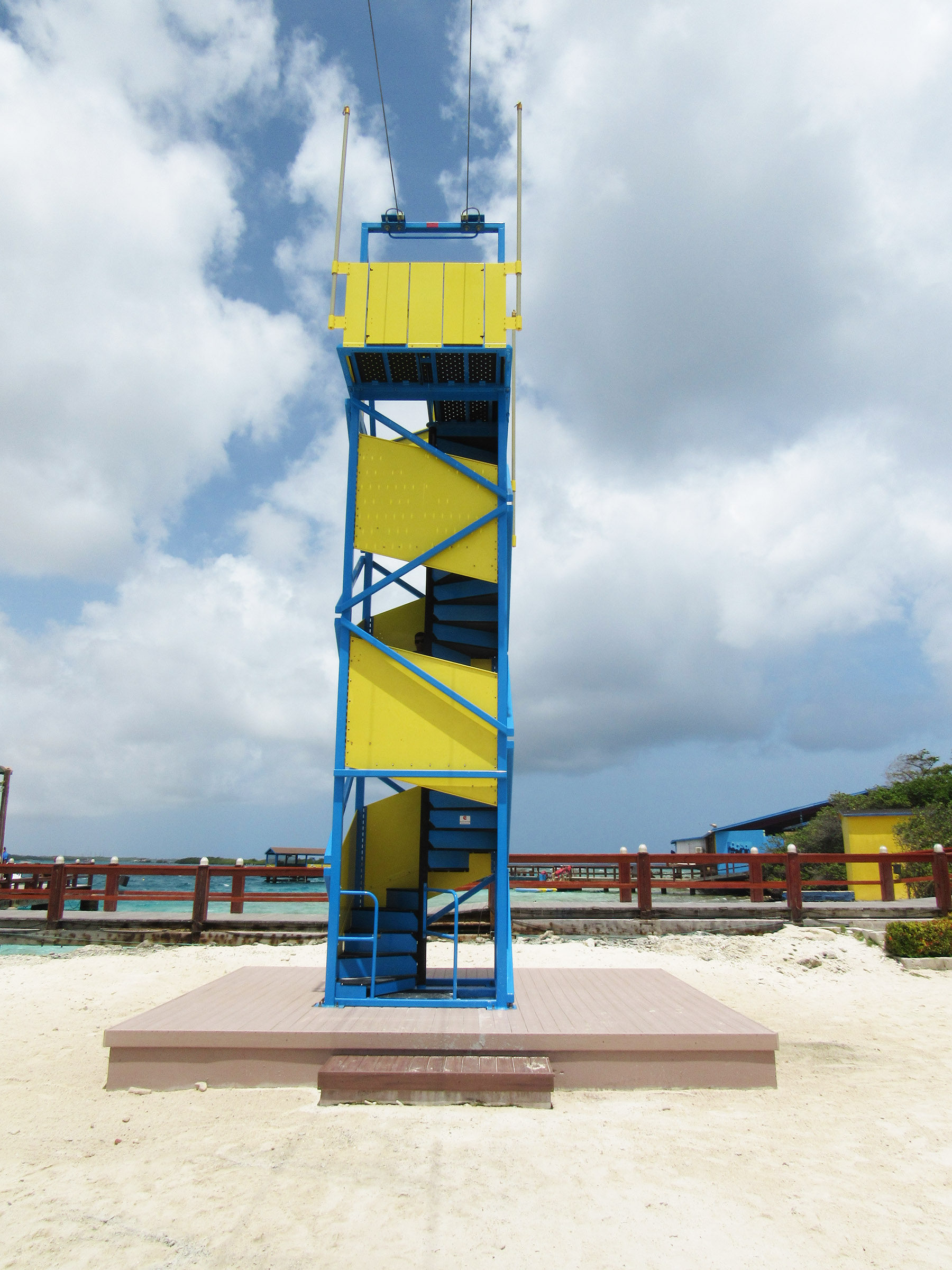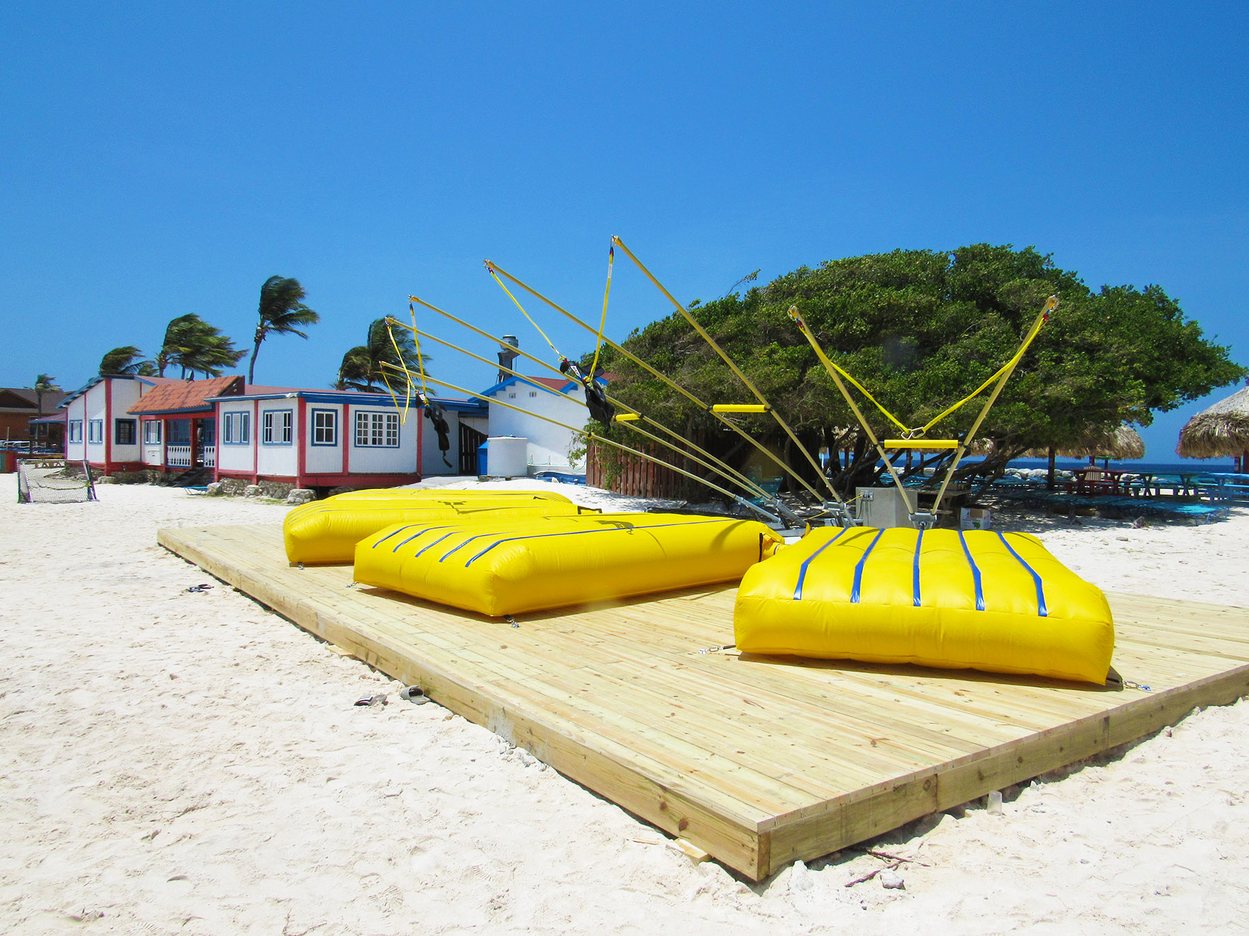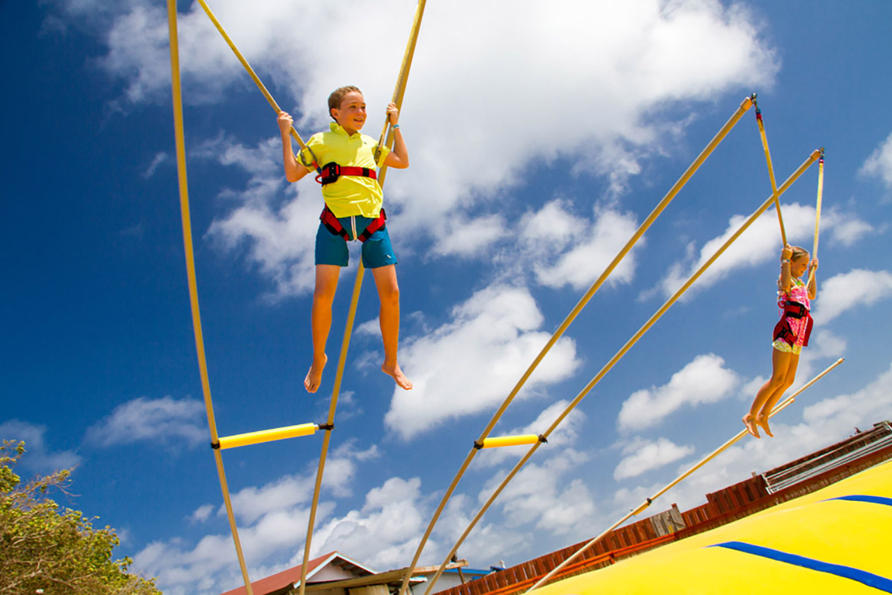 De Palm Island resorts hired Extreme Engineering’s design team, as they knew it would best suit their needs in terms of simplicity of operations and maintenance to the investment level in the attractions. Extreme Engineering worked very closely on the Aruba project, ensuring the right product mix to seamlessly fit with their existing waterpark and other amenities. Because this would be the only zipline, including an Extreme Air Jumper, in Aruba it was crucial on the placement of the attractions and also stylization. The design team placed the zipline right along the edge of the beach, giving zipliners a breathtaking, open ocean view below. The vibrant colors of the attractions were chosen to match De Palm’s company logo and blend in with the other colorful structures surrounding the island. Today De Palm Island Resorts is proud to claim the only zipline experience in Aruba.