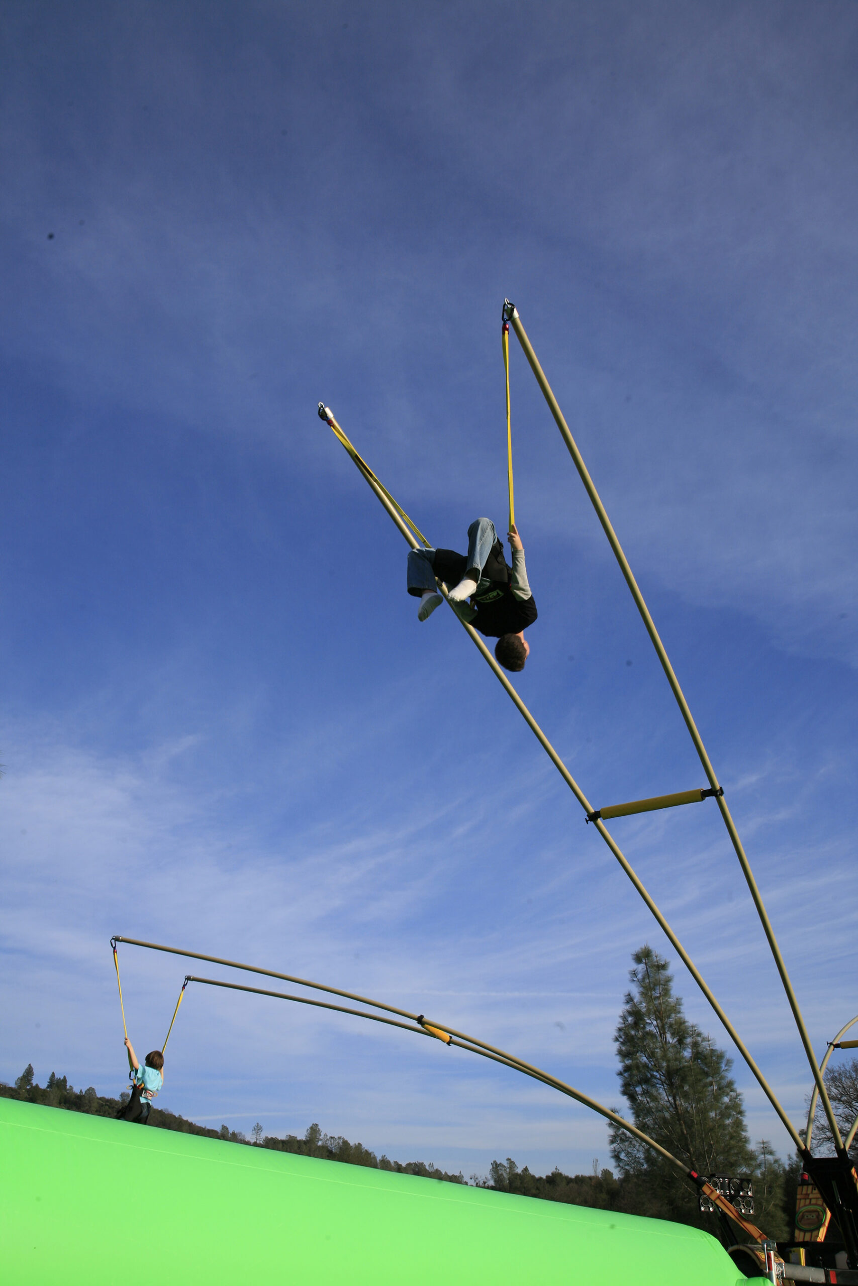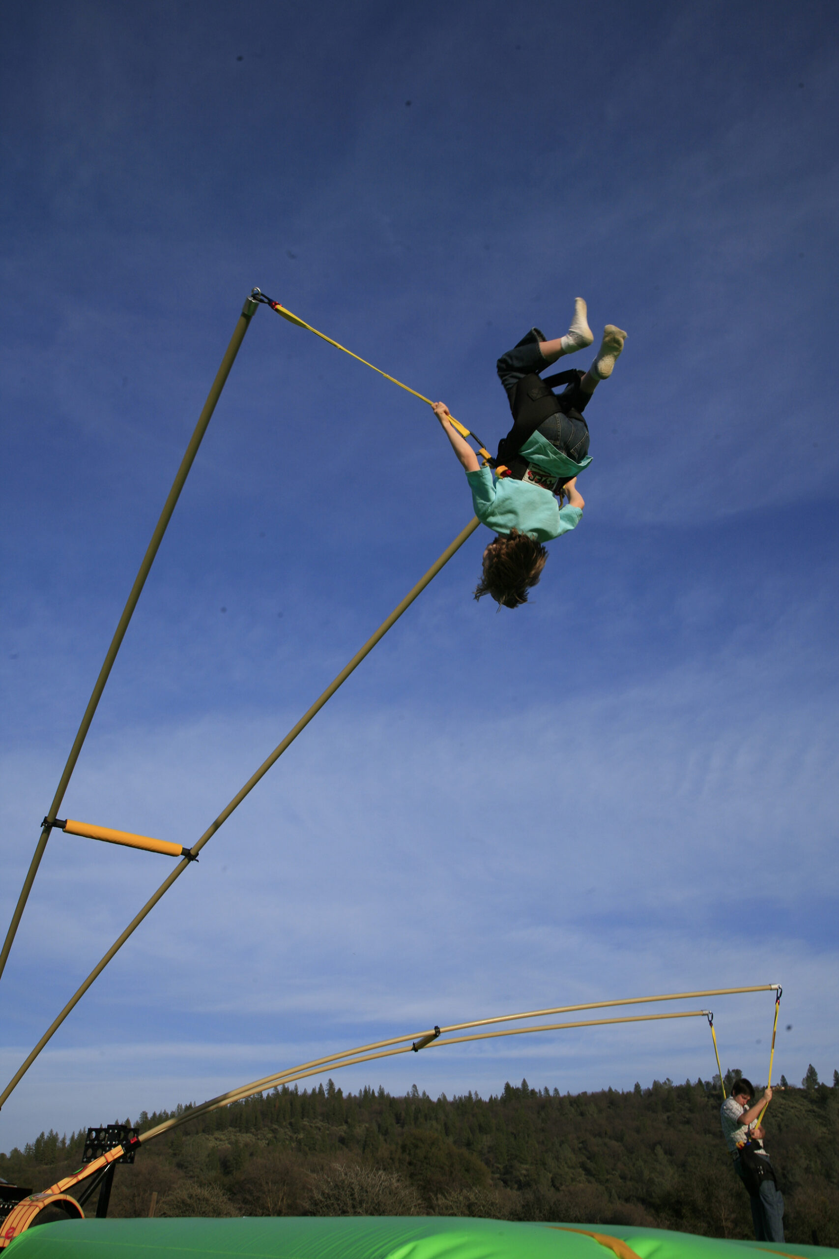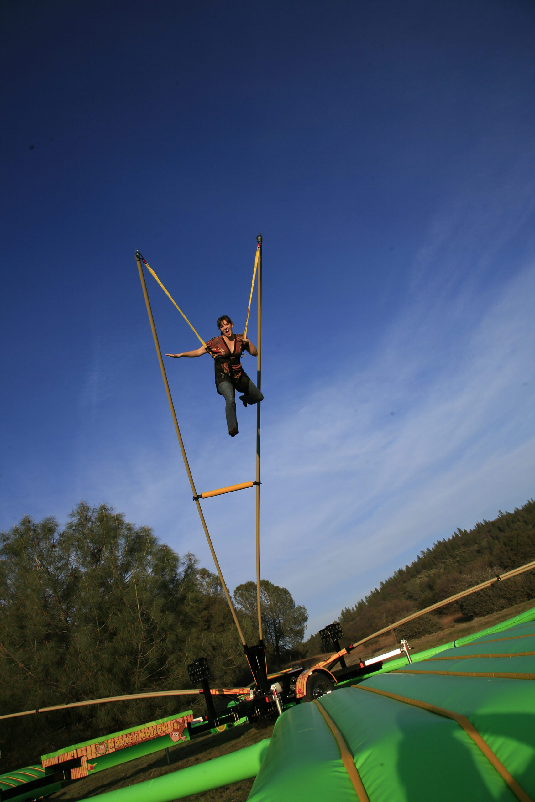 - Pole technology and inflatable pad allows participants to spring up to 25 feet in the air.