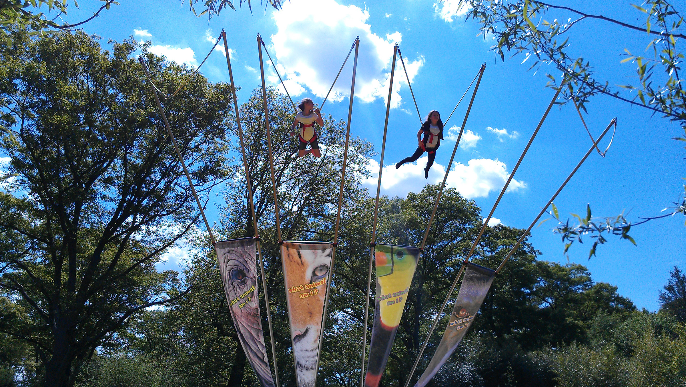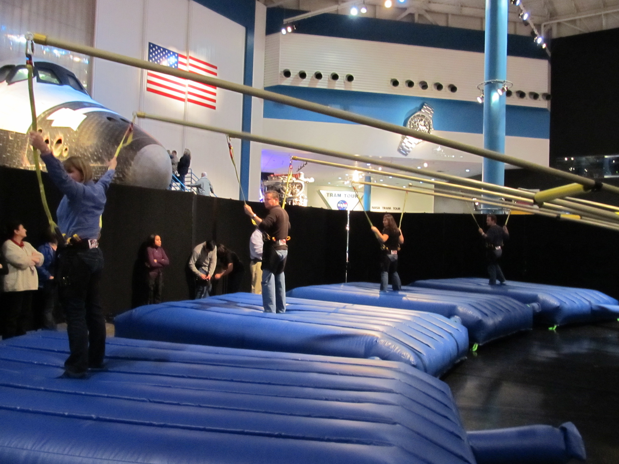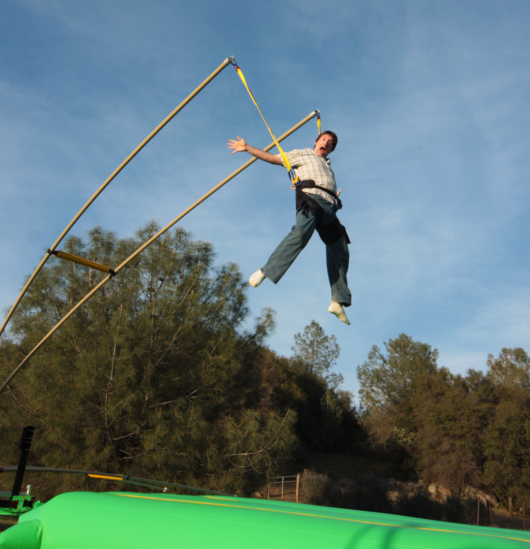 - Pole technology and inflatable pad allows participants to spring up to 25 feet in the air.