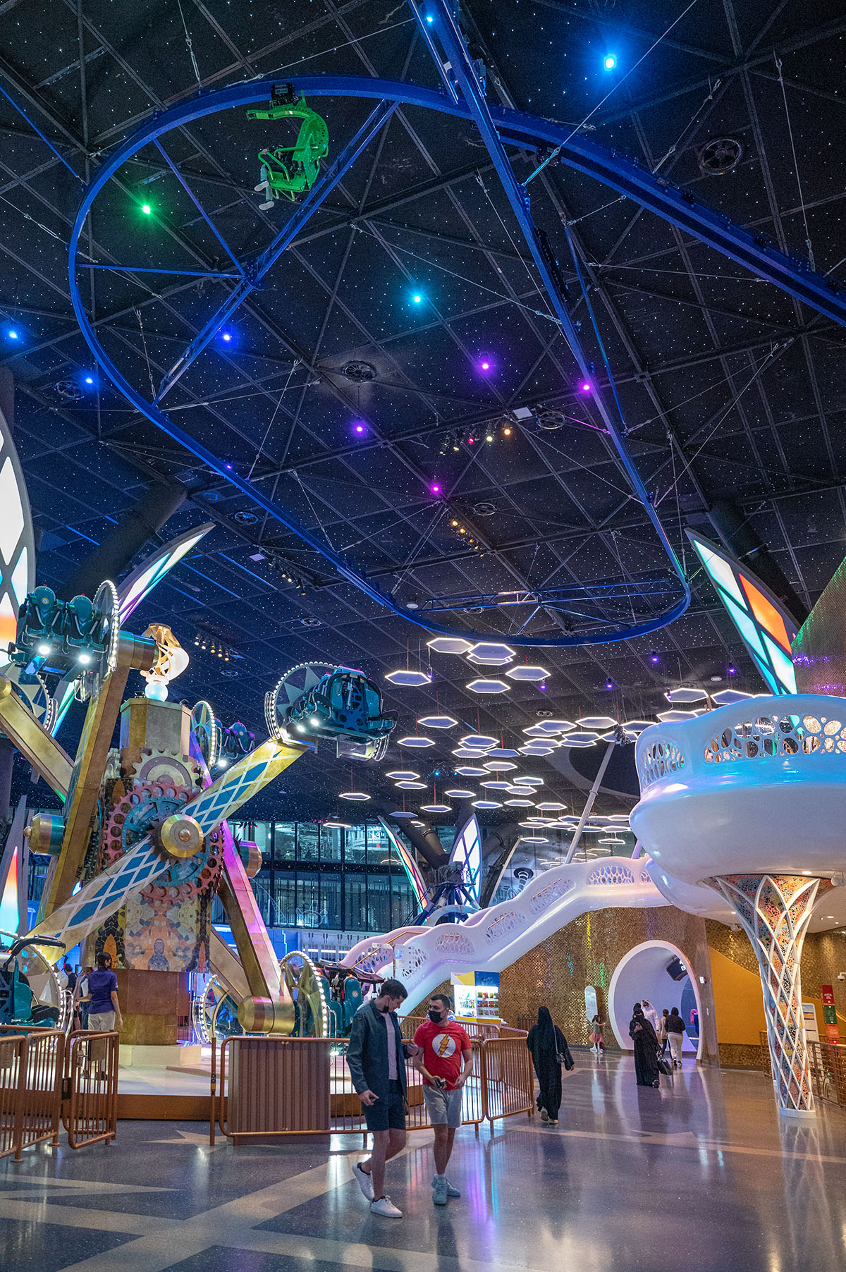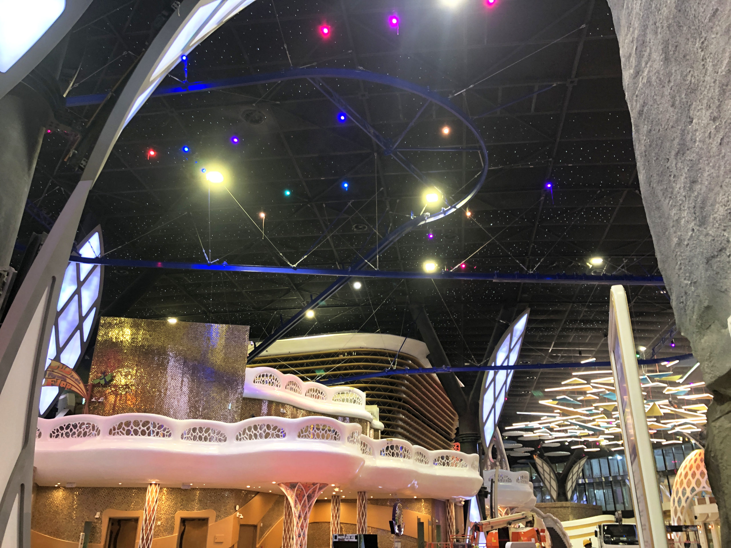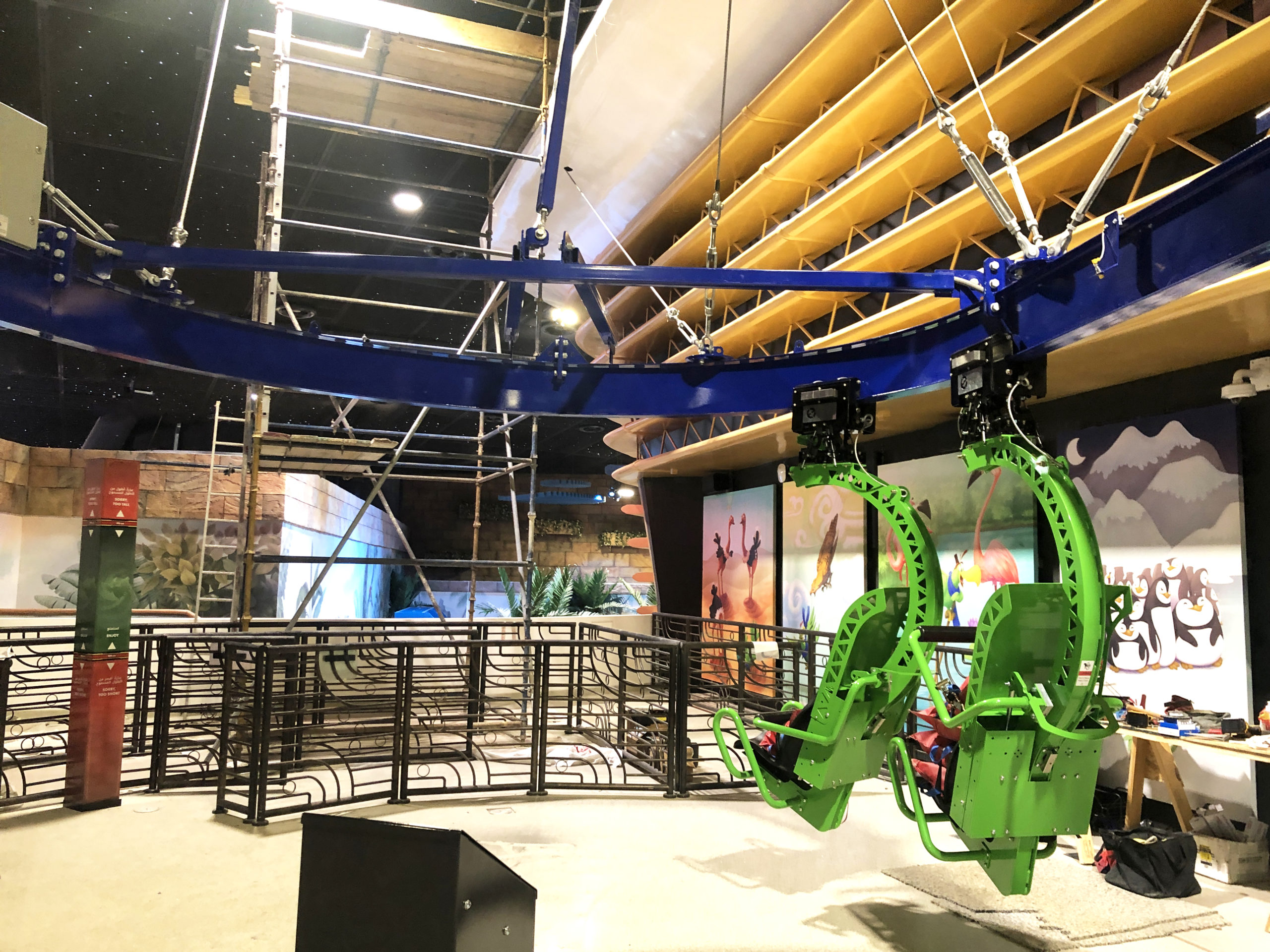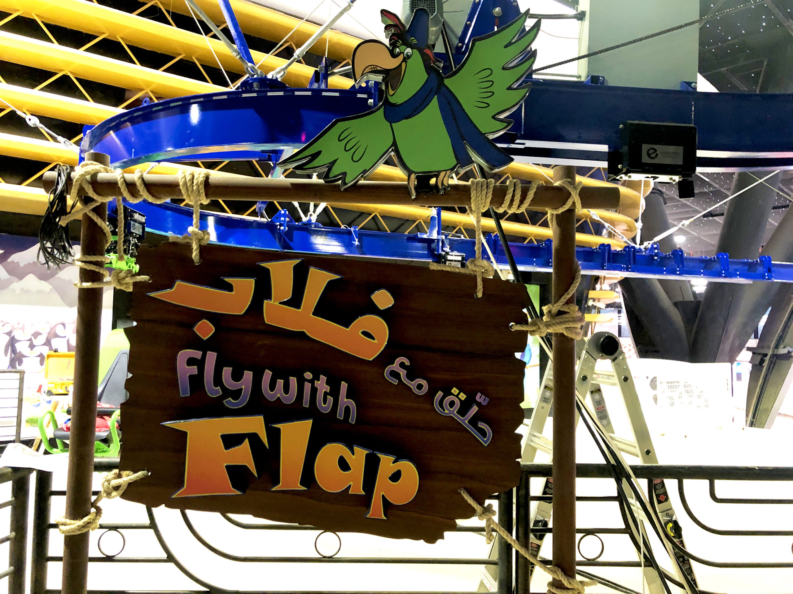 The Cloud Coaster for Doha Oasis’ park, Quest, is now open. This is the very first Cloud Coaster in Qatar and the largest indoor project in the world. Over 600 liner feet (over 200 meters) of floating roller coaster track launches guests above the amusement park below. The Cloud Coaster includes a raised platform for queuing. The suspended roller coaster was designed to be installed within the building’s infrastructure by eliminating the need, and additional costs, for large roller coaster columns. This coaster attraction was named “Fly With Flap,” an iconic tropical parrot park character named Flap. Extreme Engineering partnered with Nassal, an industry leading master planning company, on the project. Extreme Engineering was very excited to be apart of one of the largest indoor theme parks in the world. The Cloud Coaster utilizes a Class 3 ride vehicle, show control system, is ADA friendly, TUV compliant and can take riders as short as 40 inches tall.